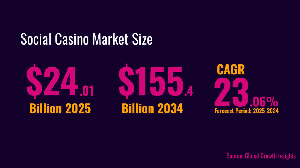 - In North America, the social casino market reached an estimated size of USD 3.425 billion in 2024, with forecasts of USD 5.151 billion by 2030 (CAGR ~6–7 %) grandviewresearch.com